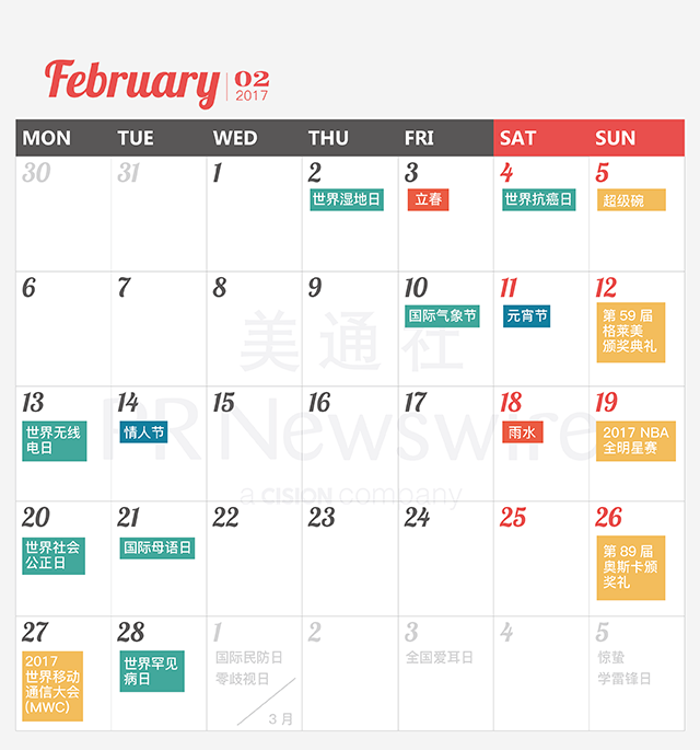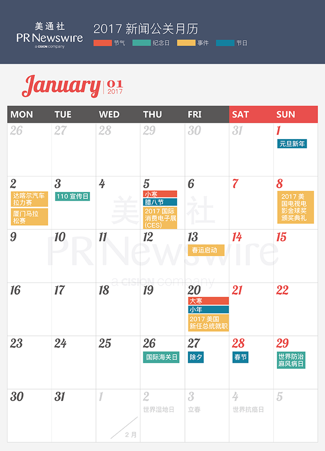 2017年馬上到來,美通社連續第四年推出新聞公關月歷,收錄了2017年度共292個重要節日、紀念日和新聞事件,線上PC版和手機版實時更新重要的會議活動信息,點擊原文搶先收藏!