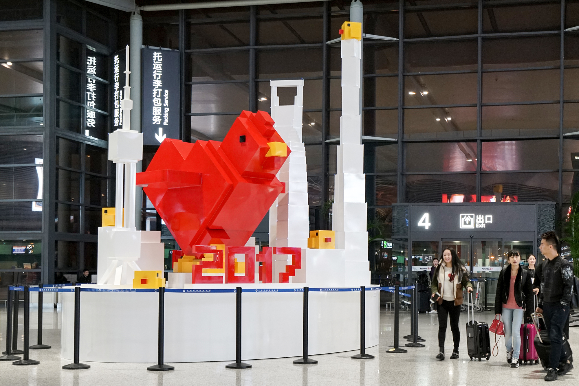 在上海虹橋國際機場2號航站樓出發及到達大廳,一組由上海機場德高動量廣告有限公司策劃的方塊像素丁酉年“飛雞”藝術雕塑群吸引了很多人的目光。兩組藝術雕塑群分別位于到達大廳行李提取處南北兩側,可愛的“飛雞爸爸”和“小黃雞寶寶們”的家庭組合,令每一位在春運期間抵達虹橋機場的乘客都能感受到新年氛圍和回家的溫馨,活潑伶俐地展現了酉雞年新春主題。(美通社,2017年1月16日上海)