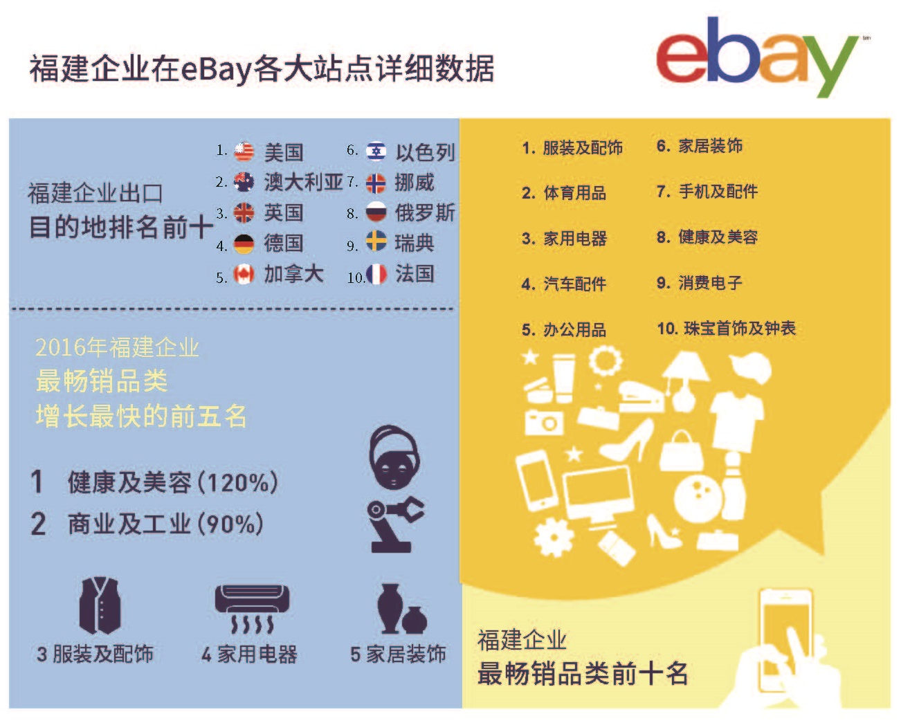 eBay與福建省商務(wù)廳、福州市人民政府共同簽署了戰(zhàn)略合作協(xié)議。三方將攜手合作實(shí)現(xiàn)優(yōu)勢(shì)資源整合,重點(diǎn)推動(dòng)福建省跨境電商出口產(chǎn)業(yè)在政策扶植、人才培養(yǎng)、產(chǎn)業(yè)優(yōu)化和物流基建等領(lǐng)域的創(chuàng)新發(fā)展。據(jù)eBay內(nèi)部數(shù)據(jù)顯示, 在2016年,福建跨境電商零售出口企業(yè)通過(guò)eBay平臺(tái)將產(chǎn)品出口至200多個(gè)國(guó)家和地區(qū),其中,排名前三的出口目的地市場(chǎng)分別為美國(guó)、澳大利亞和英國(guó)。在暢銷品類方面,服飾配件、體育用品、家用電器、汽配和辦公用品分別居銷售榜前五位。(美通社,2017年4月7日福州)