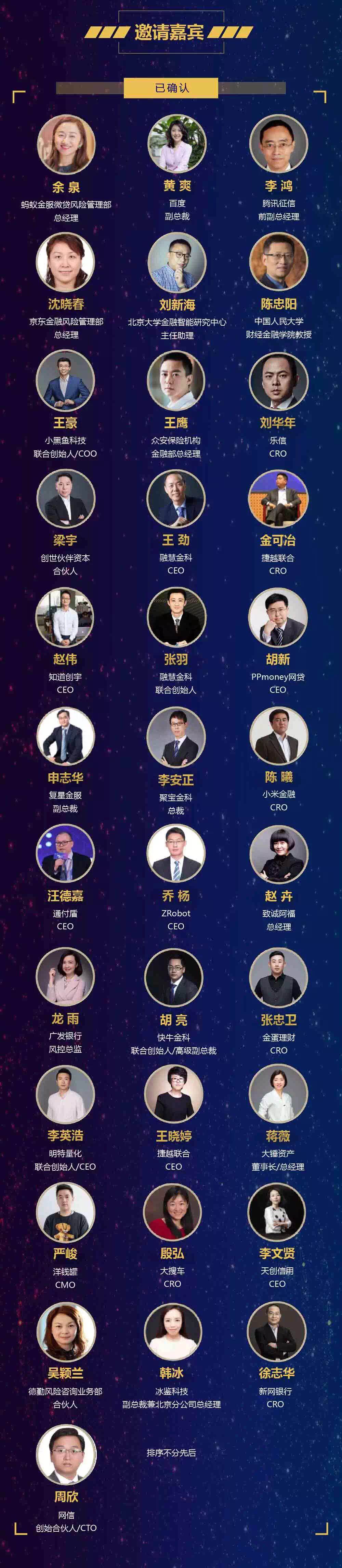 屆時,幾十位金融界大咖將出席活動。如融慧金科CEO王勁;知道創(chuàng)宇CEO趙偉;融慧金科聯(lián)合創(chuàng)始人張羽;小米金融CRO、信貸業(yè)務負責人陳曦;捷越聯(lián)合創(chuàng)始人、快催收創(chuàng)始人王曉婷;明特量化聯(lián)合創(chuàng)始人、CEO李英浩;ZRobot CEO喬楊;致誠阿福總經理趙卉;PPmoney網貸CEO胡新;創(chuàng)世伙伴資本合伙人梁宇;通付盾CEO汪德嘉;聚寶金科總裁李安正;大錘資產董事長、總經理蔣薇;冰鑒科技副總裁韓冰;捷越聯(lián)合CRO金可冶;快牛金科聯(lián)合創(chuàng)始人、高級副總裁胡亮;廣發(fā)銀行風控總監(jiān)龍雨;金蛋理財CRO張忠衛(wèi);小黑魚科技聯(lián)合創(chuàng)始人、COO王豪;眾安保險機構金融部總經理王鷹;樂信CRO劉華年;復星金服副總裁申志華;大搜車CRO殷弘;洋錢罐CMO嚴峻;天創(chuàng)信用CEO李文賢;新網銀行CRO徐志華;世界銀行集團IFC特聘專家丁宇;德勤風險咨詢業(yè)務部合伙人吳穎蘭;網信創(chuàng)始合伙人、CTO周欣、麥子金服副總裁兼首席風控官李曉忠等。