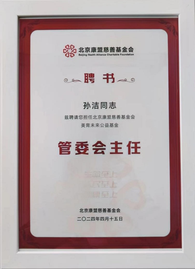 2024年4月17日,北京康盟慈善基金會美育未來公益基金在北京建外soho舉行簽約啟動儀式。孫潔受聘擔任美育未來公益基金管委會主任,北京康盟慈善基金會秘書長張琳與美育未來公益基金會管委會主任孫潔共同出席,雙方將攜手共同為鄉村兒童青少年美育工作貢獻社會責任與公益力量。