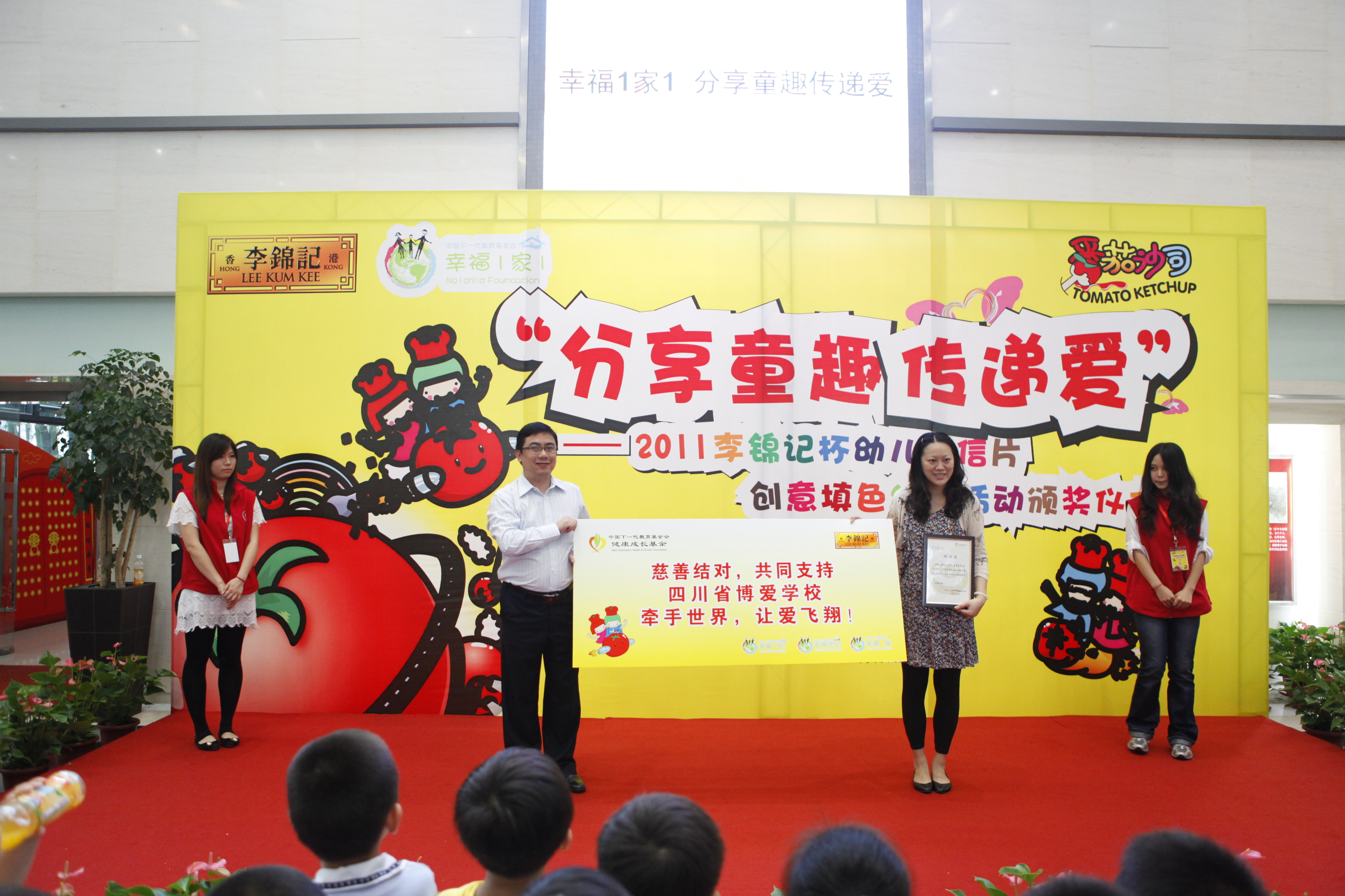 本次頒獎儀式特別為四川地震災區的兒童傳遞愛心,在比賽中脫穎而出的10幅獲獎作品,被制成愛心明信片,送往李錦記四川平武大橋博愛學校,以此架起北京、上海、廣州三地與四川地震災區兒童的友誼橋梁,共同分享童趣,傳遞關愛。