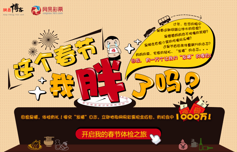 近日,借“春節回家”的特殊契機,網易博客攜手網易彩票推出“這個春節,我胖了嗎”全民在線測試的娛樂活動,誠邀全體網民一起“發福”的同時還可抽取現金紅包去投注彩票,活動輕松趣味,得到了廣大網友的一致贊譽,本次活動還得到了網易女人、網易旅游、網易論壇等頻道的特別支持,五頻道聯動出擊將春節回家的年味推向了較高潮。