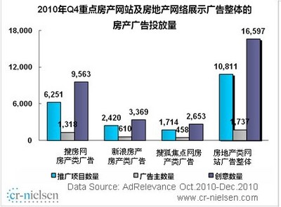 DCCI2010網絡監測數據顯示,2009一季度至2010四季度,中國房地產信息服務網站受眾到達規模統計中,搜房網各季度均居同類網站首位。2010年第四季度專業房產網站網絡廣告投放天次搜房網位居榜首,2010年第四季度搜房網網站中廣告投放創意數超過3萬個,大幅領先其他網站,2010年第四季度,中國房地產信息服務網站受眾季度月均到達率繼續保持增長的趨勢,房產類網站受眾總到達人數再創新高。2010年第四季度房產類網站的月均總到達人數創造新高,搜房網月均6153.5萬人居首。