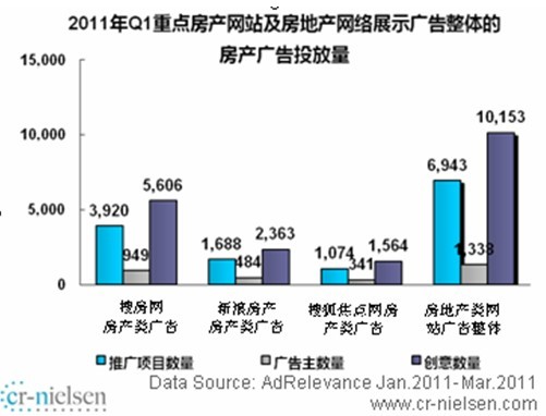 北京2011年5月4日電 /美通社亞洲/ -- CR-Nielsen(尼爾森互聯網研究)《2011年中國房地產網絡展示廣告市場研究項目報告》顯示,2011年中國房地產網絡展示廣告市場第一季度與去年同期相比呈增長態勢。2011年 Q1搜房網房產類網絡展示廣告投放量同比平穩增長。與去年同期相比,2011年 Q1搜房網房產廣告推廣項目數同比增長91.7%,增長較快。