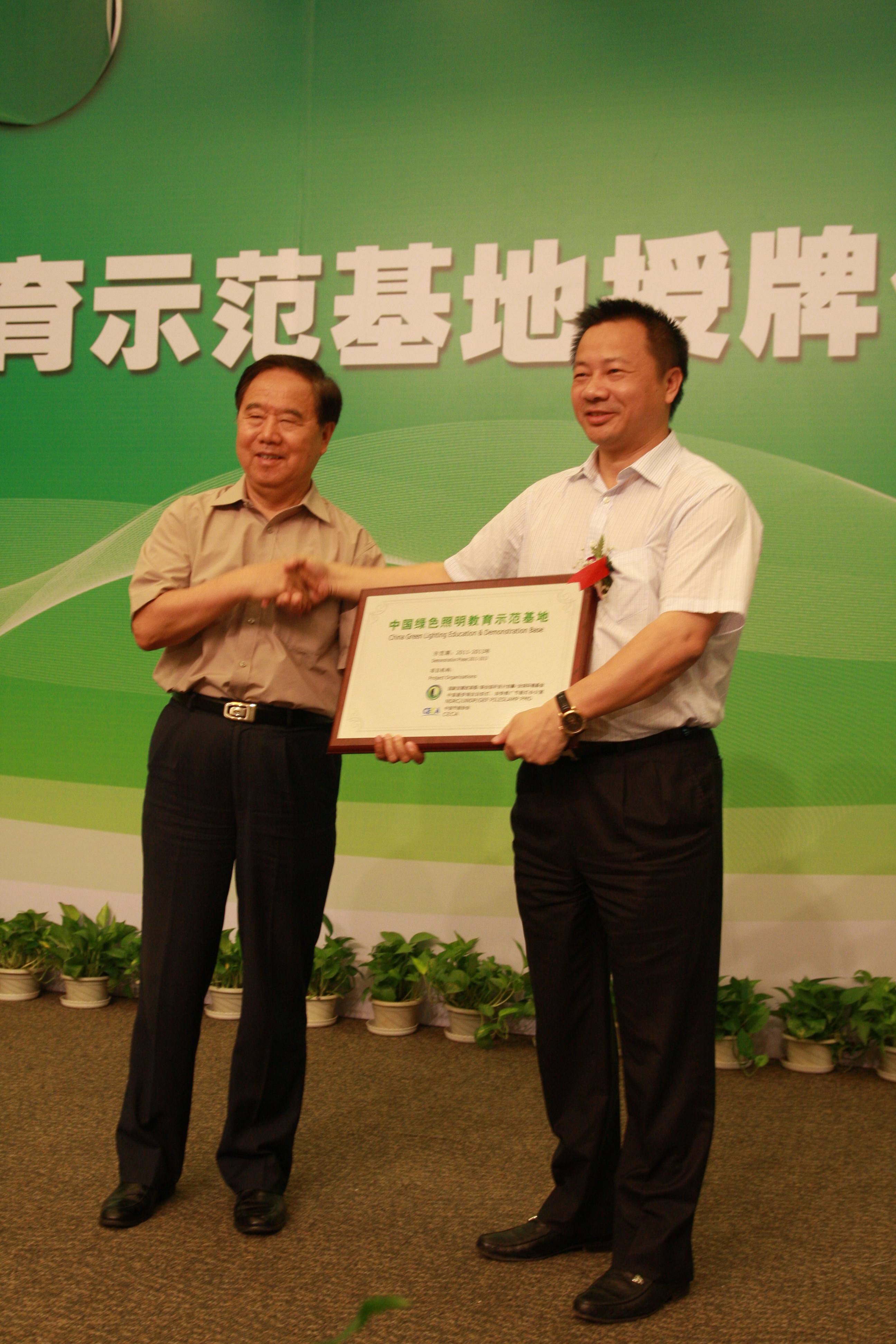 中國節(jié)能協(xié)會(huì)理事長傅志寰向雷士照明董事長吳長江授予“中國綠色照明教育示范基地”牌匾