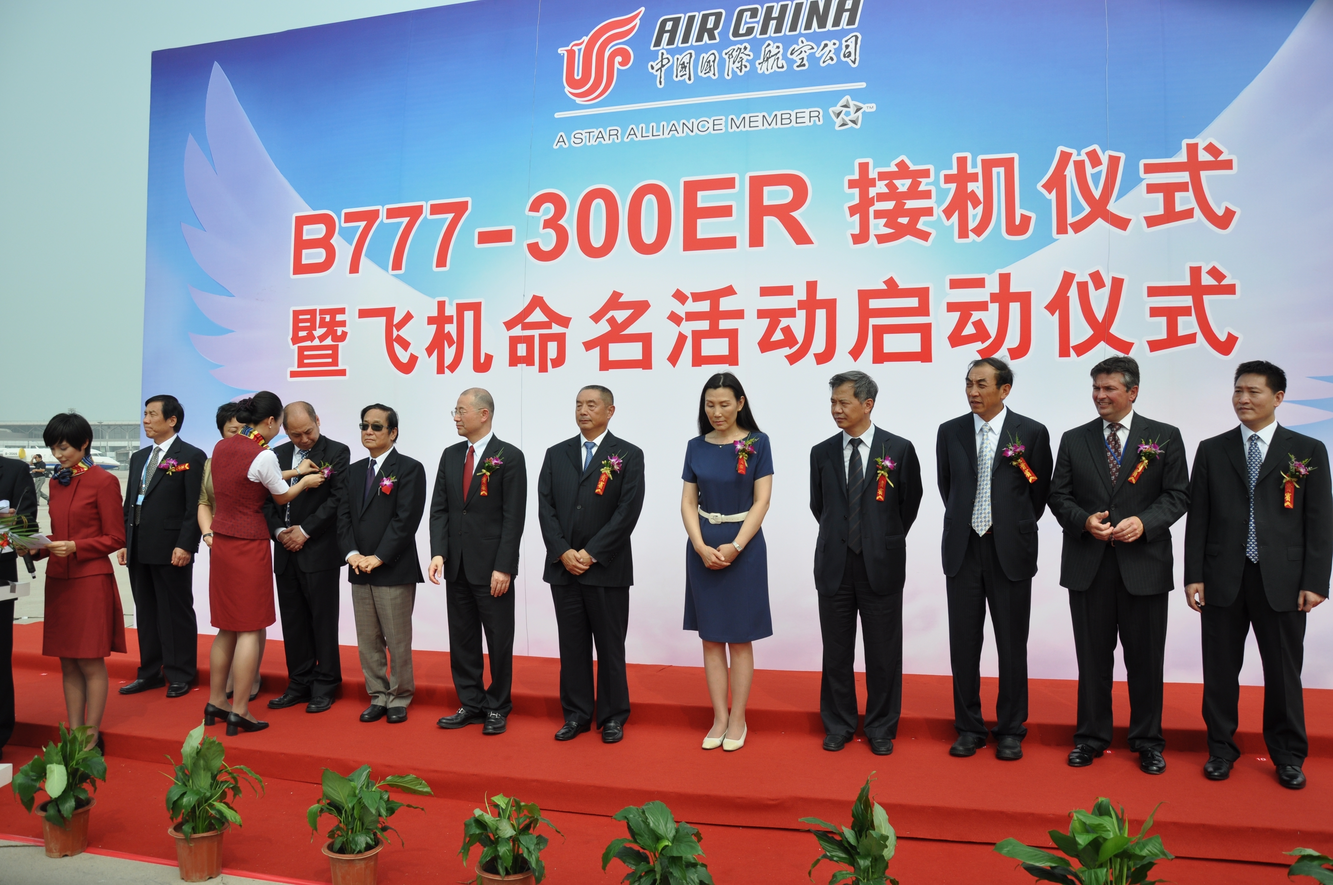 7月21日下午3時,飛機抵達的同時,國航在北京首都機場停機坪舉行了簡單而熱烈的接機儀式。中航集團總經理、國航董事長孔棟,中航集團黨組書記、國航副董事長王銀香,國航黨委書記樊澄,國航副總裁賀利、王明遠,國航黨委副書記馮潤娥,國航總經濟師許建強等出席儀式。首都機場股份公司總經理張光輝等駐場單位代表和波音公司代表到場祝賀。藝術大師、國航標志的主要設計者韓美林與首航機長、乘務長共同為飛機命名活動揭匾。國航常旅客代表還在儀式上暢談了全程體驗的美好感受。