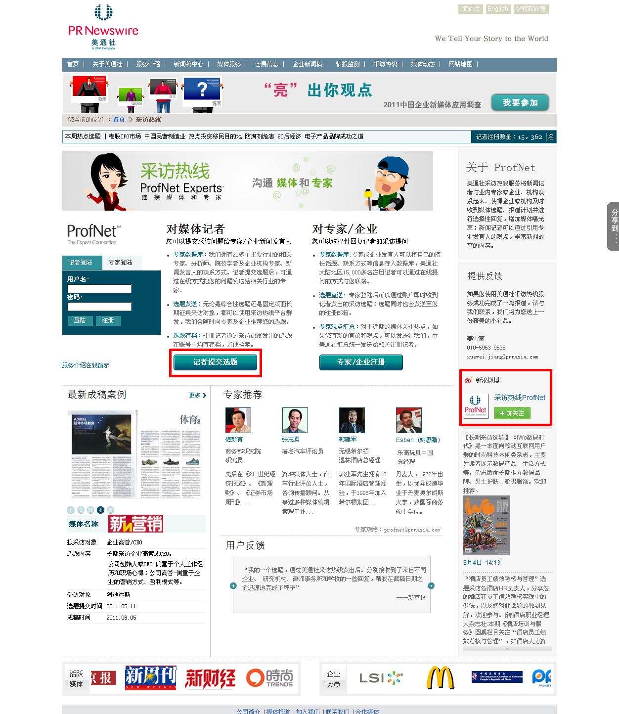 美通社中文采訪熱線是國內首個也是唯一實時收集媒體采訪選題的媒體情報服務,改版后的采訪熱線平臺更加簡潔易用,媒體選題提交與專家在線注冊各項功能清晰劃分,并集成了新浪微博@采訪熱線ProfNet 內容實時展示、國內主流社交媒體平臺一鍵分享功能,記者用戶可以通過“快速提交選題”按鈕,無需注冊輕松提交發送相關選題提問,并可通過新浪微博@采訪熱線 ProfNet 私信功能快速提問,通過微博與行業專家、分析師、企業新聞發言人保持實時互動。