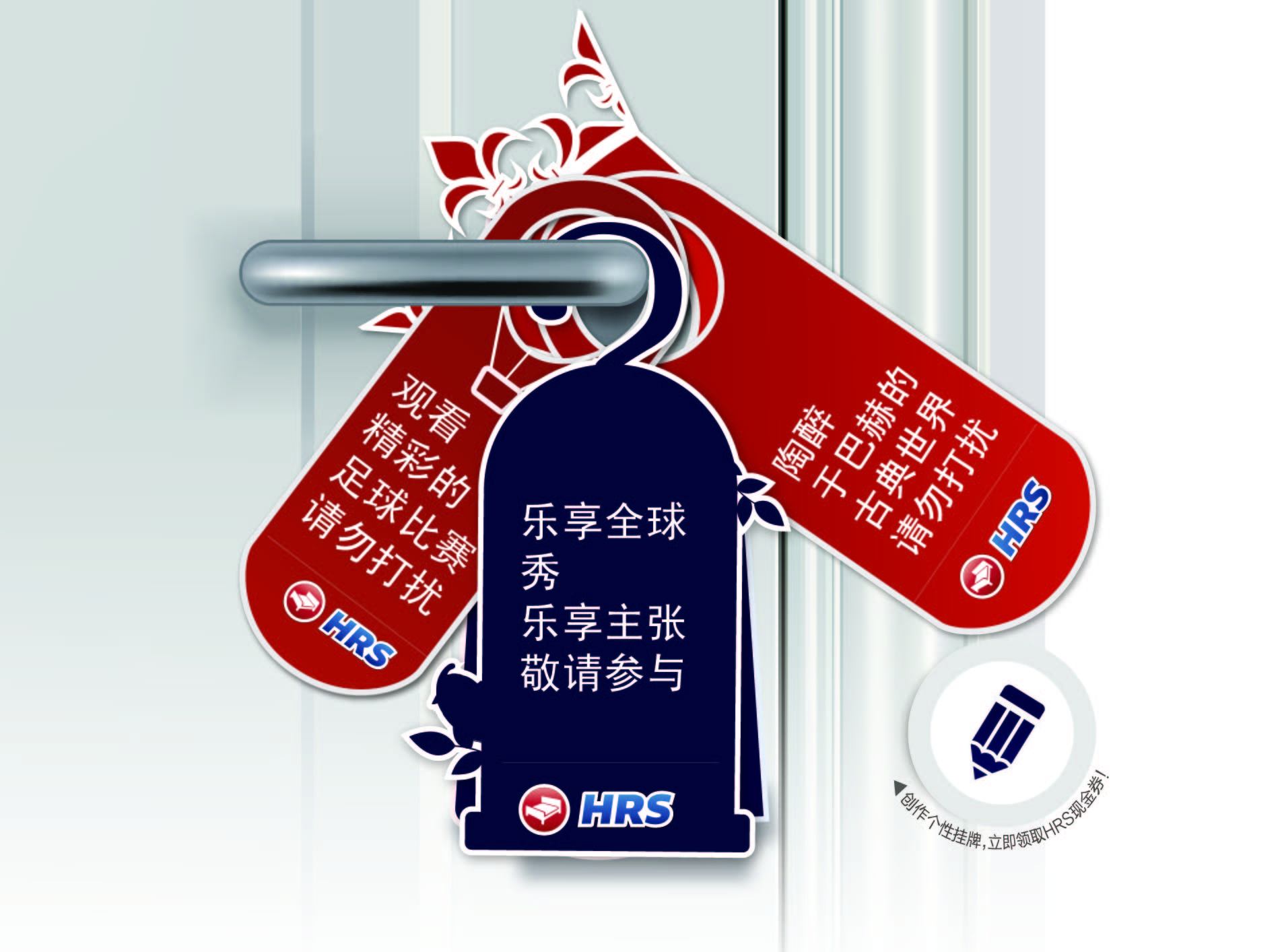 每個酒店都可以看到放置在房門上的掛牌,千篇一律,缺乏新意。在張揚個性的今天,全球訂房網 HRS.cn 希望通過一張小小門牌,發掘住客內心的樂享主張,激發靈感。這也符合全球訂房網 HRS.cn 一貫倡導“個性化”的生活理念。通過專業化的預訂網絡,可以根據喜好挑選酒店,隨心組合行程,打造獨特的旅途。
