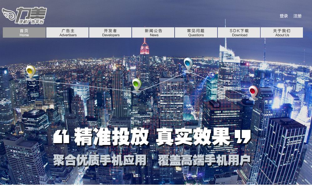 力美移動廣告平臺 -- 力美廣告?zhèn)髅阶灾餮邪l(fā)的智能手機廣告平臺,是由國際著名風險投資商 IDG 在中國投資的唯一一家專業(yè)移動媒體。平臺瞄準7億手機用戶,致力于為數(shù)以萬計的企業(yè)廣告主提供精準的移動互聯(lián)網(wǎng)產品營銷和品牌推廣服務,為手機應用開發(fā)者創(chuàng)造公正和優(yōu)質的廣告收益。