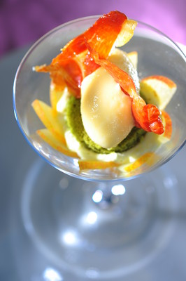 美饌杰作絕不局限于主菜,創(chuàng)意甜品的匠心巧究更將西班牙黑毛豬的傳奇演繹得淋漓盡致,彰顯主廚非凡的廚藝。希艾力為極品西班牙火腿嚴(yán)選理想配角,包括希臘乳酪冰沙、蜜瓜雪葩、綠茶蛋糕、香桃燉蛋及酸忌廉木薯粉。五項材料的和合交融,正好以清爽淡雅的味道烘托出火腿的天然芳香,成就了一道復(fù)雜而明快的甜品 -- 希臘乳酪冰沙配蜜瓜雪葩、西班牙火腿、綠茶蛋糕、香桃燉蛋及酸忌廉木薯粉。