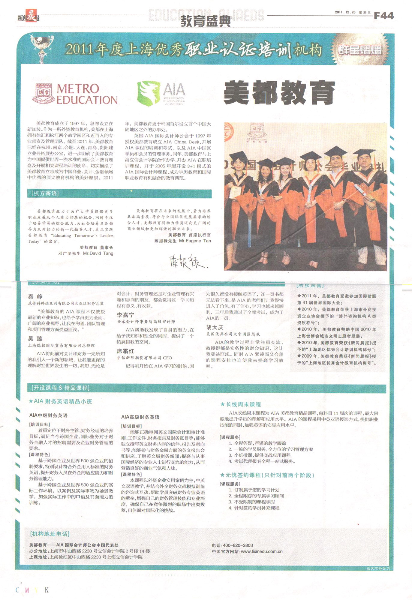 上海2012年1月9日電 /美通社亞洲/ -- 近日,由《新聞晨報》和《時代報》聯合推出的“2011年度上海優秀教育培訓機構展示活動”這一教育盛典揭曉了評選結果,美都教育榮獲2011年度上海優秀教育培訓機構稱號。至此,美都教育已連續三年摘得該獎項的桂冠,這是對過去一年美都教育發展壯大最誠摯的褒獎。同時,能獲得此獎項,也表明美都教育領跑上海職業培訓的雄厚實力已被主流媒體和培訓市場所認可。