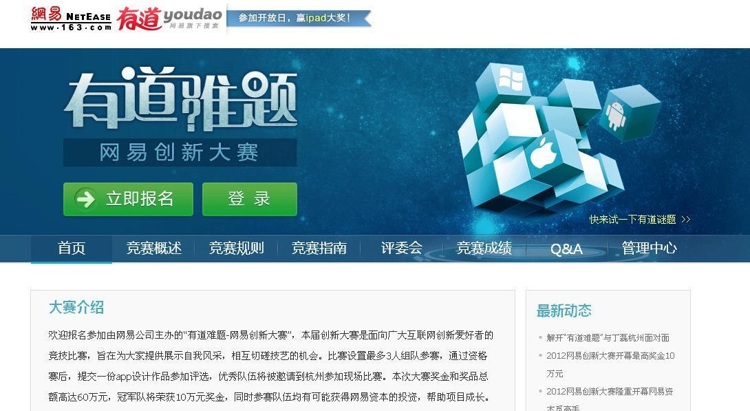 “有道難題”創新大賽是面向廣大互聯網創新愛好者的競技比賽。旨在為有技術創新理想的人們提供切磋技藝、交流思想的機會。同時,網易也希望人才庫會通過本次大賽而得到充實。與往屆單純的編程競賽不同,本屆大賽圍繞移動互聯網創新展開,進入初賽的選手都將有機會一展自己在教育領域的APP開發潛力。