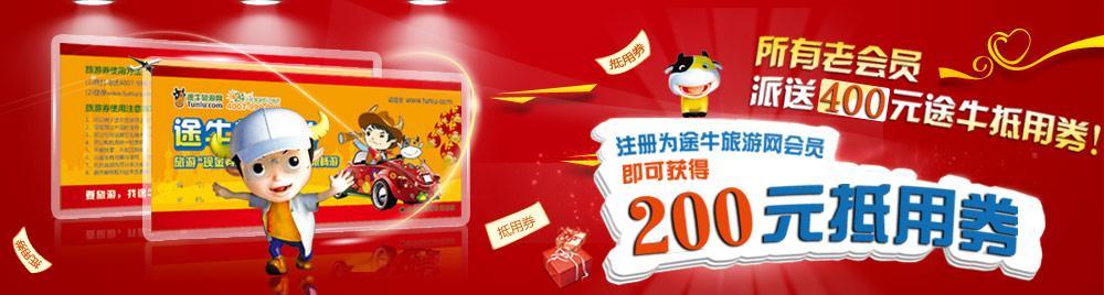 北京和上海2012年6月5日電 /美通社亞洲/ -- 即日起,途牛旅游網向各位新老會員派送抵用券:新會員注冊禮 -- 只要注冊成為途牛旅游網會員,即可獲得200元途牛抵用券;老會員答謝禮 -- 所有2012年05月21日前注冊的老會員可獲得400元途牛抵用券。途牛抵用券即領即用,繽紛旅游產品隨心挑。