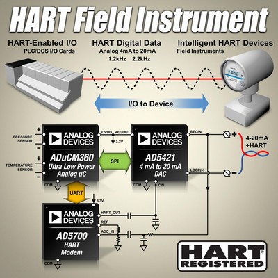 配套產(chǎn)品包括ADI公司的HART調(diào)制解調(diào)器IC AD5700(用于HART通信協(xié)議編碼與解碼的單芯片設(shè)計),以及用于環(huán)路供電型智能發(fā)射器應(yīng)用的16位DAC AD5421