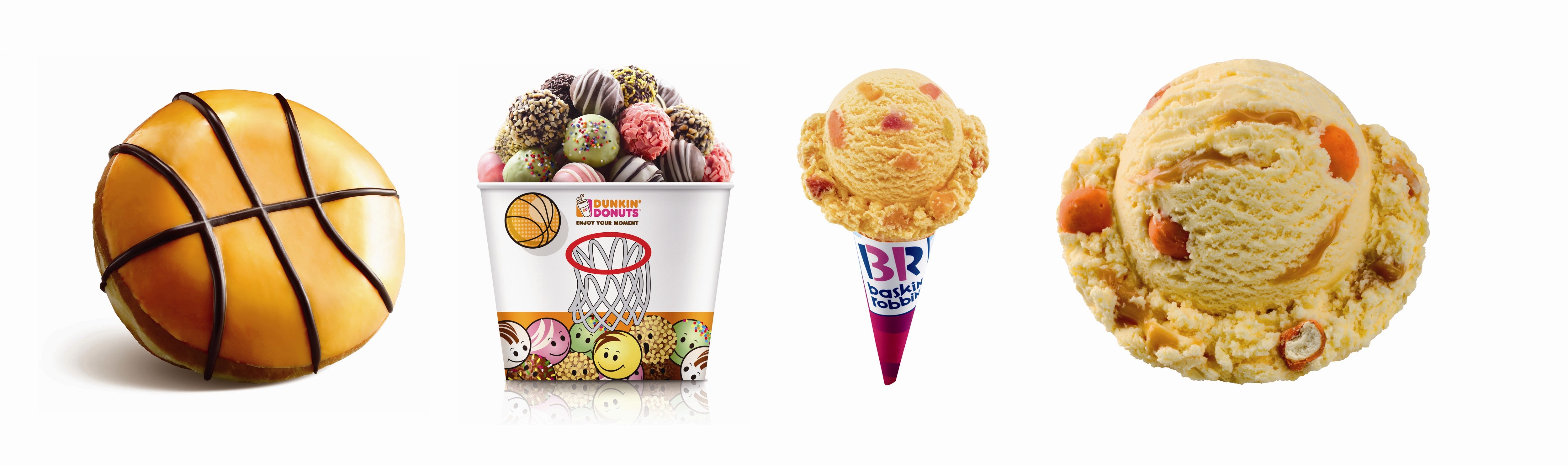 從左至右:唐恩都樂“灌籃小子”甜甜圈、“灌籃小不點(diǎn)”桶,以及芭斯羅繽“霸王球”冰淇淋、“灌籃高手”口味冰淇淋