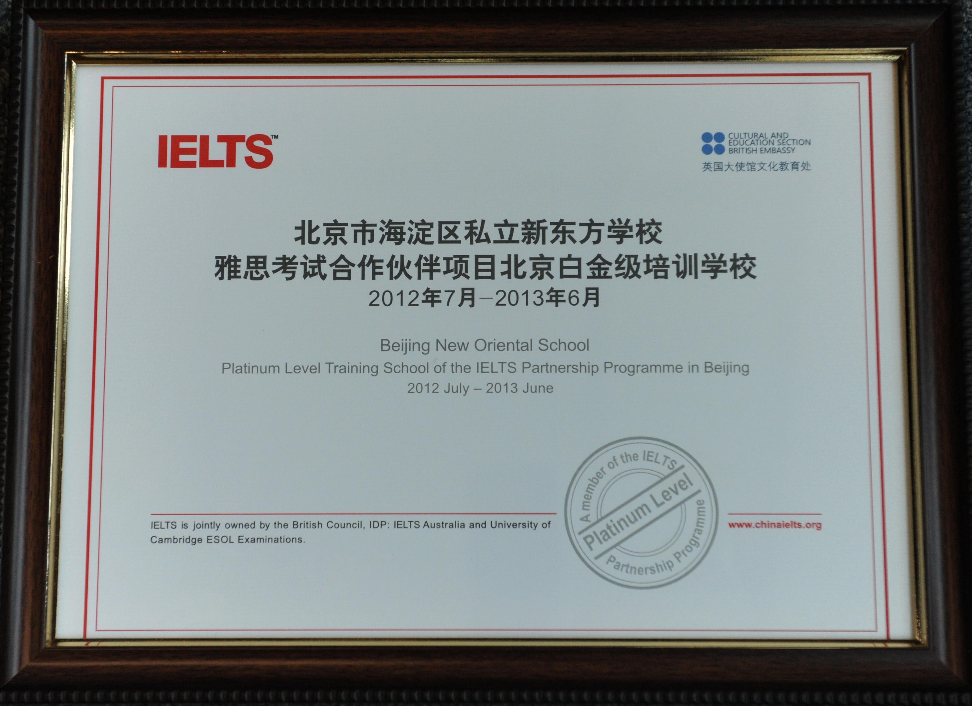 北京2012年9月11日電 /美通社/ -- 近日,雅思考試主辦方(在中國通過英國駐華使/領(lǐng)館文化教育處運(yùn)作)為北京新東方學(xué)校頒發(fā)“雅思考試合作伙伴項(xiàng)目北京市白金級培訓(xùn)學(xué)?!闭J(rèn)證證書。白金級認(rèn)證為此合作項(xiàng)目的別認(rèn)證。