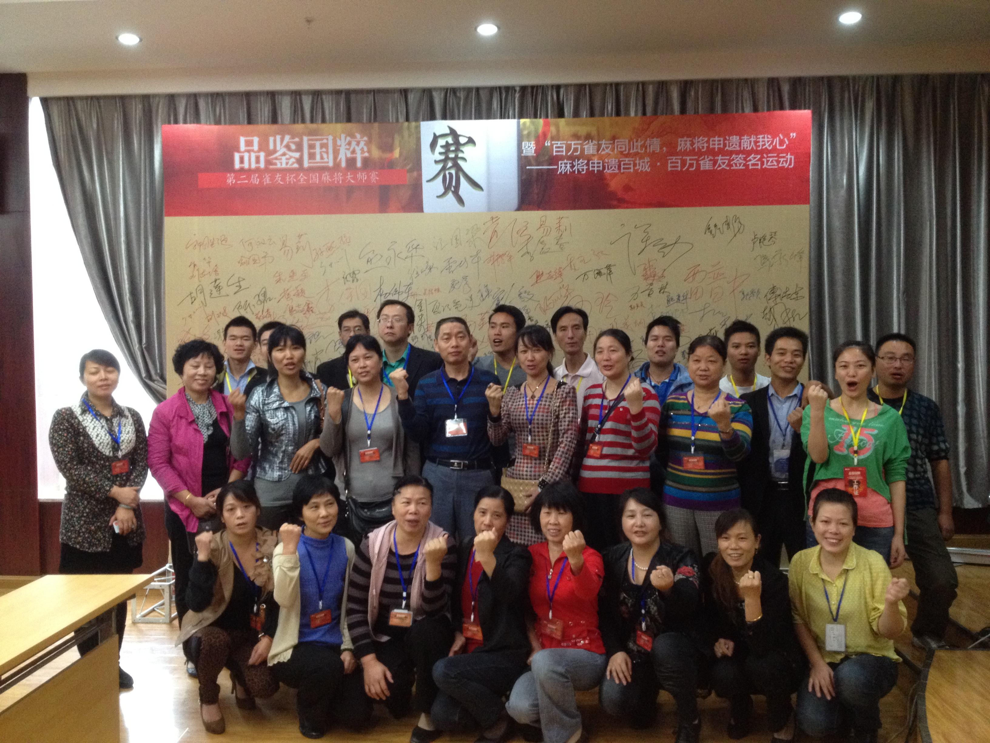 比賽開始前,麻將愛好者紛紛在“百萬雀友同此情,麻將申遺獻我心”申遺背景板上一一簽名,表達了對于傳統國粹 -- 麻將申遺的殷切期盼,而更多的麻友則以申遺為背景,忙著拍照、發微博留念。