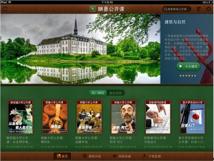 網易公開課 iPad 版曾在初次上線時創造了僅用36小時就位列 App Store 中文免費應用排行榜榜首的奇跡。升級到 V3.0.0 的網易公開課 iPad 版客戶端,從界面到操控都有了很大改進。