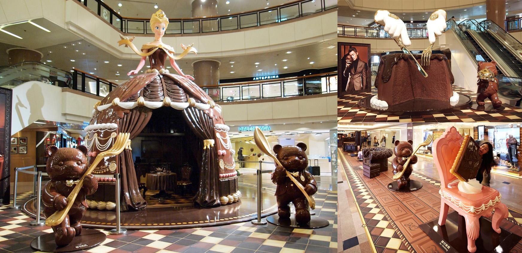 海港城將整個港威商場大堂打造成“朱古力大宅”,讓每個人都可成為童話中的主角!推開朱古力磚大門走進100%可口的朱古力大宅,內有小熊管家恭候貴賓光臨。商場大堂I及II分別有優雅精致的公主造像及其長裙下的英式大宅,加上心思十足的巨型朱古力蛋糕,將大家引領入夢寐以求的朱古力浪漫盛宴。