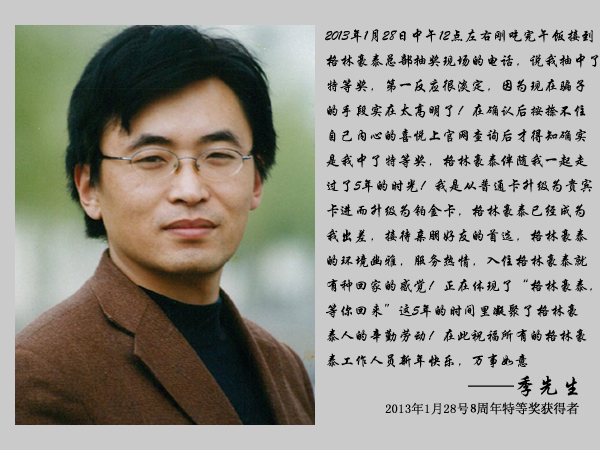季先生是格林豪泰鉑金卡會員,從2008年開始就入住格林豪泰,也算是格林豪泰的一名老顧客?!耙话愠霾罨蛘哒写笥?、客人,都會選擇格林豪泰酒店,格林豪泰舒適、干凈的入住體驗,以及滿意周到的服務是我選擇格林豪泰的理由,很感謝格林豪泰舉辦這次活動”!被問及獲獎感言時,季先生響亮地喊出了格林豪泰的宣傳語 -- “格林豪泰,等您回來”!