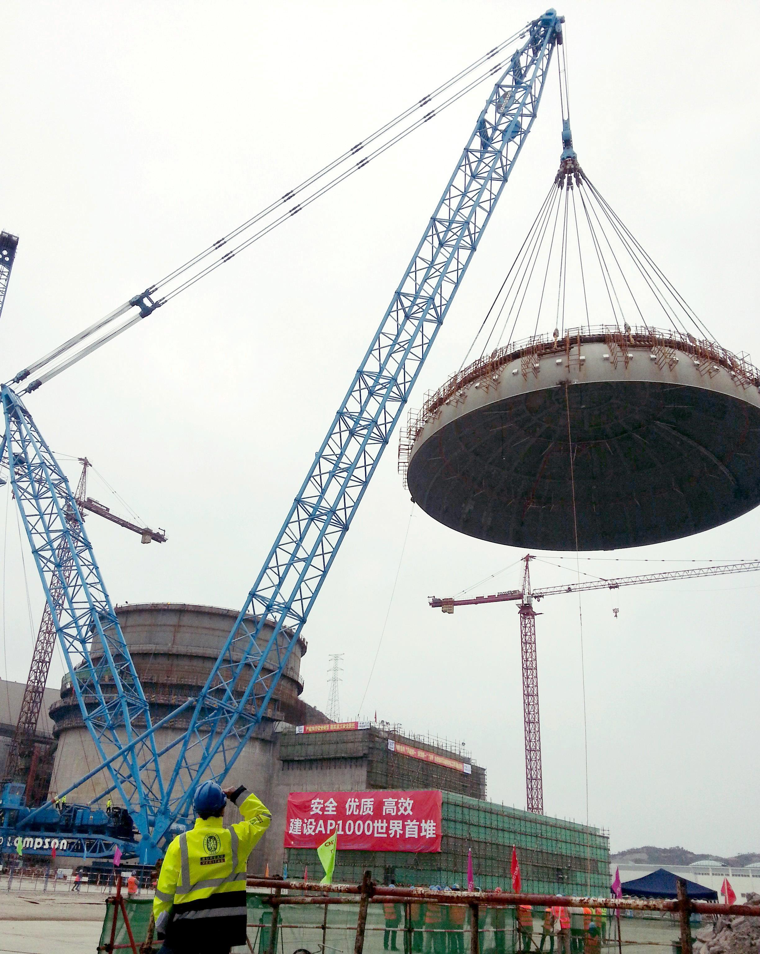 本次吊裝總歷時1小時36分。安全殼頂封頭是半橢球形封頭,直徑約40米,內高11.468米,壁厚41.3毫米。頂封頭外表面安裝有圍堰系統和空氣導流板U型支架,內表面安裝有消防噴淋管道等附件,用以在運行時實現非能動安全功能。安裝附件后的頂封頭總重量約655噸。三門核電一號機組鋼制安全殼頂封頭具有吊裝重量重、體積大、壁厚薄、起吊半徑遠等特點。為了保證頂封頭吊裝工作安全順利的進行,項目各方通力協作,并提前進行了認真的籌劃和準備,編制了有效的方案、程序和計劃。在必維和項目參與各方共同保障在吊裝過程中嚴格執行預定方案,保證了三門核電1號機組鋼制安全殼的順利就位。
