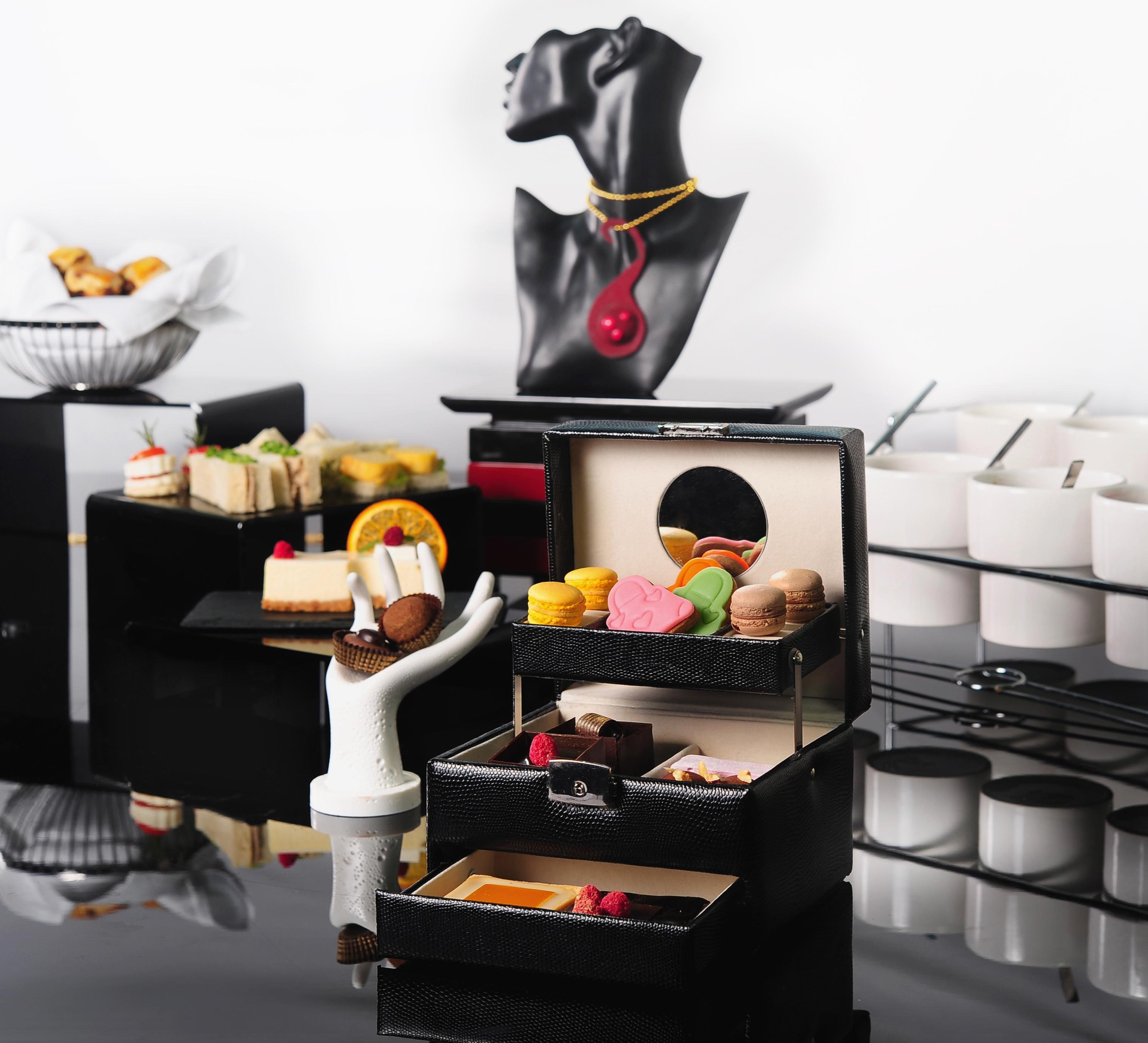 來自亞洲頂級巧克力甜品大師 Cary 甄選9款優雅精致的巧克力藝術甜品,多彩絢麗。它們被放置在三層式的奢華皮質珠寶盒中,整個擺盤獨具匠心。如果深吸一口,甜而不膩的巧克力濃香即刻撲鼻而來。