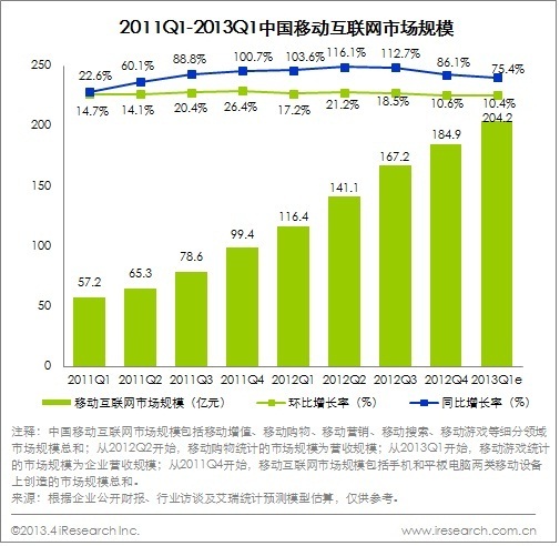 2013Q1由于假期的影響,移動(dòng)互聯(lián)網(wǎng)整體增速有所降低,但是移動(dòng)互聯(lián)網(wǎng)經(jīng)過2011-2012年的高速發(fā)展已經(jīng)到了關(guān)鍵性的一年。