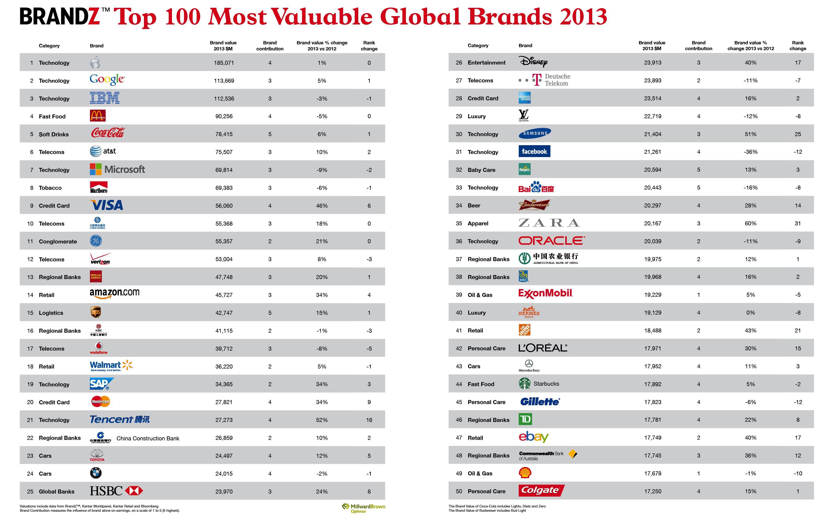 BrandZ 最具價值全球品牌百強排行榜由 Millward Brown Optimor 針對 WPP 旗下公司開發,現已進入第八個年頭。這項調查不僅對各家公司的財務和業務績效(使用來自彭博社和 Kantar Worldpanel 公司的數據)開展縝密分析,并估算出品牌在促進業務收入增長、增加企業市值方面所產生的價值,還獨樹一幟地就全球數千個“面向消費者”和“企業對企業”品牌對全球 200 多萬消費者進行采訪,據以衡量品牌價值。品牌的消費者認知度是決定品牌價值的重要因素,因為品牌是業務績效、產品交付、定位清晰度和領先優勢的集合體。榜單的排名考慮了地區差異,因為即使是真正的全球品牌,品牌貢獻的衡量方式也可能存在重大的國別差異。