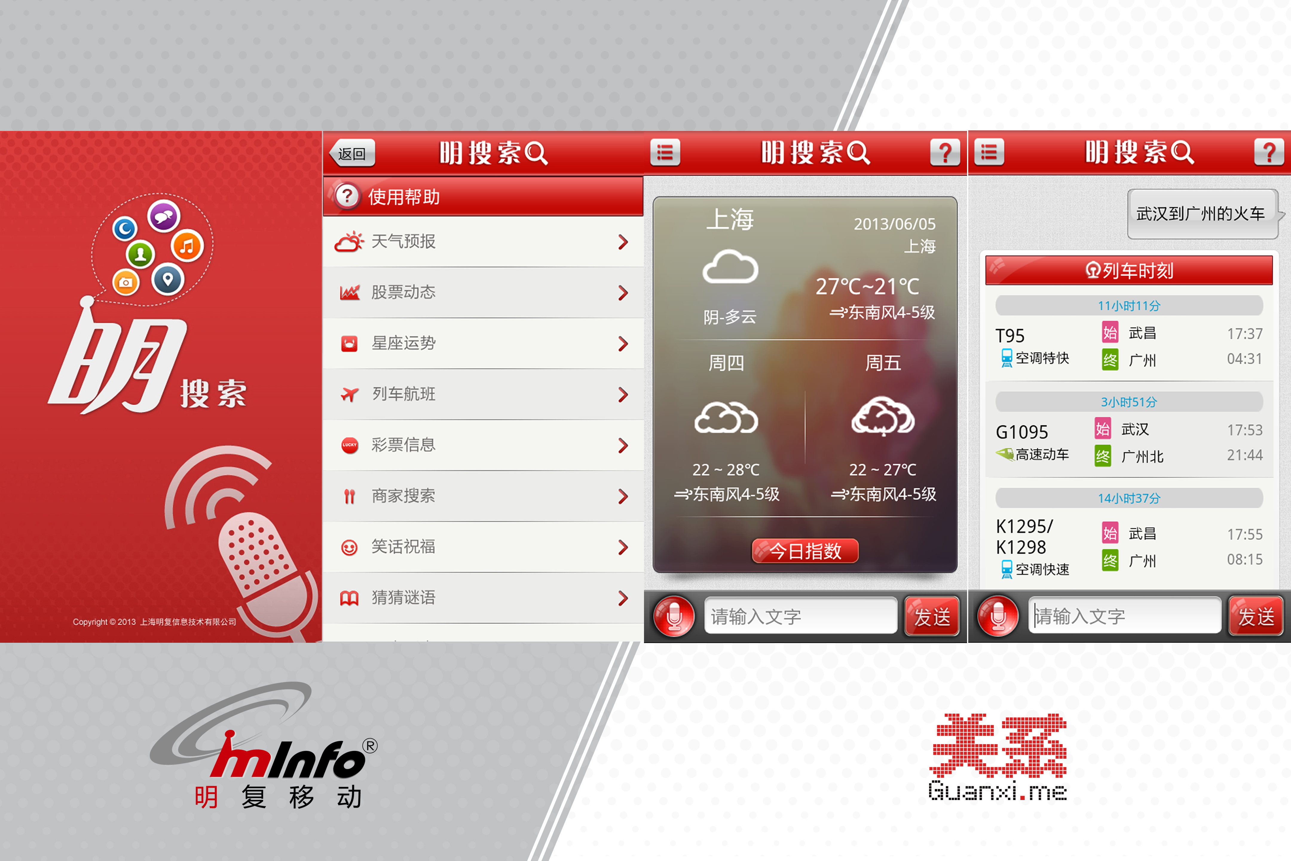該款A(yù)PP囊括本地生活、娛樂休閑、實用信息等20余種信息,為用戶提供衣食住行、天氣、航班、股票等全方位的信息搜索服務(wù)。它是明復(@明復mInfo)傳統(tǒng)手機服務(wù)“明生活”和“明搜索”的升級版,優(yōu)化了手機客戶端界面及結(jié)果展現(xiàn)方式。內(nèi)容和技術(shù)的強強聯(lián)合,對話的交互方式,使它擁有絲毫不遜色于Siri的用戶體驗,但面向更廣泛的手機用戶群體。