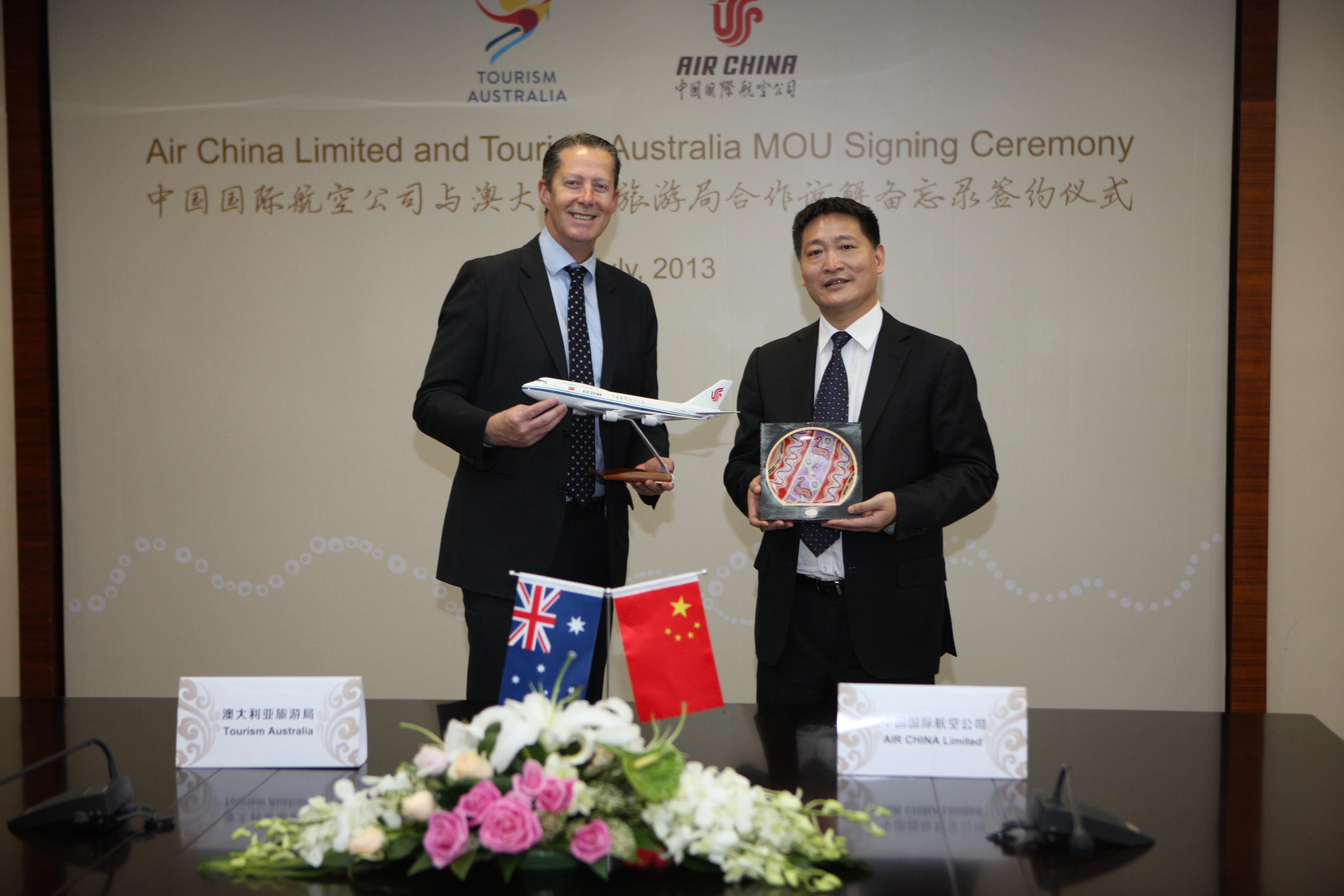 北京2013年7月2日電 /美通社/ -- 2013年7月1日,中國國際航空股份有限公司(以下簡稱“國航”)與澳大利亞旅游局(以下簡稱“澳旅局”)舉辦合作諒解備忘錄簽字儀式,雙方高層就赴澳旅游市場推廣及航空運力優化配置達成協議。國航副總裁王明遠及澳旅局行政總裁麥勤偉(Andrew McEvoy)代表雙方簽署了備忘錄。