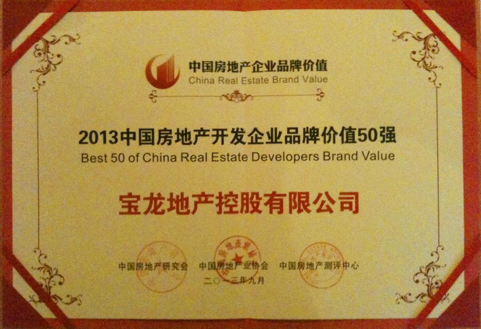 寶龍地產(HK.1238)獲得2013中國房地產開發企業品牌價值50強(第36名)、中國商業地產企業品牌價值10強(第2名)和中國房地產企業較佳雇主品牌30強(第26名)三項大獎。