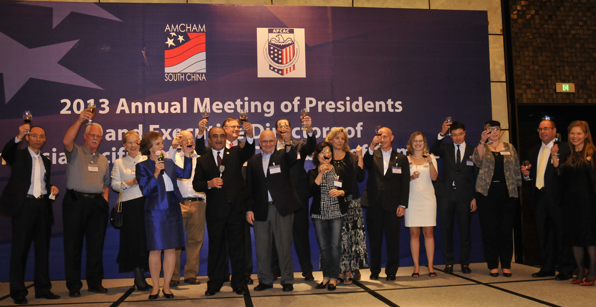 亞太地區美國商會年會歡迎酒會11月13日晚在廣州四季酒店舉行。于當天抵穗的來自亞太22個國家及地區的美國商會會長及執行理事出席了酒會并將參加11月14-17日在華南美國商會總部及會議中心,美國商會塔以及順德美國商會塔及會議中心舉行的年會。