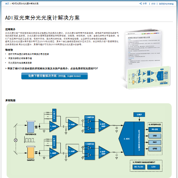 上海2013年11月20日電 /美通社/ -- Analog Devices, Inc.(NASDAQ: ADI),全球領(lǐng)先的高性能信號(hào)處理解決方案供應(yīng)商,近日推出了一款雙光束分光光度計(jì)解決方案。作為ADI當(dāng)月精選方案,這款光度計(jì)憑借低功耗、高精度和極度可靠的穩(wěn)定性,可廣泛適用于科研和工業(yè)領(lǐng)域,為工程師解決該類設(shè)計(jì)難題提供了簡單高效的解決方案。