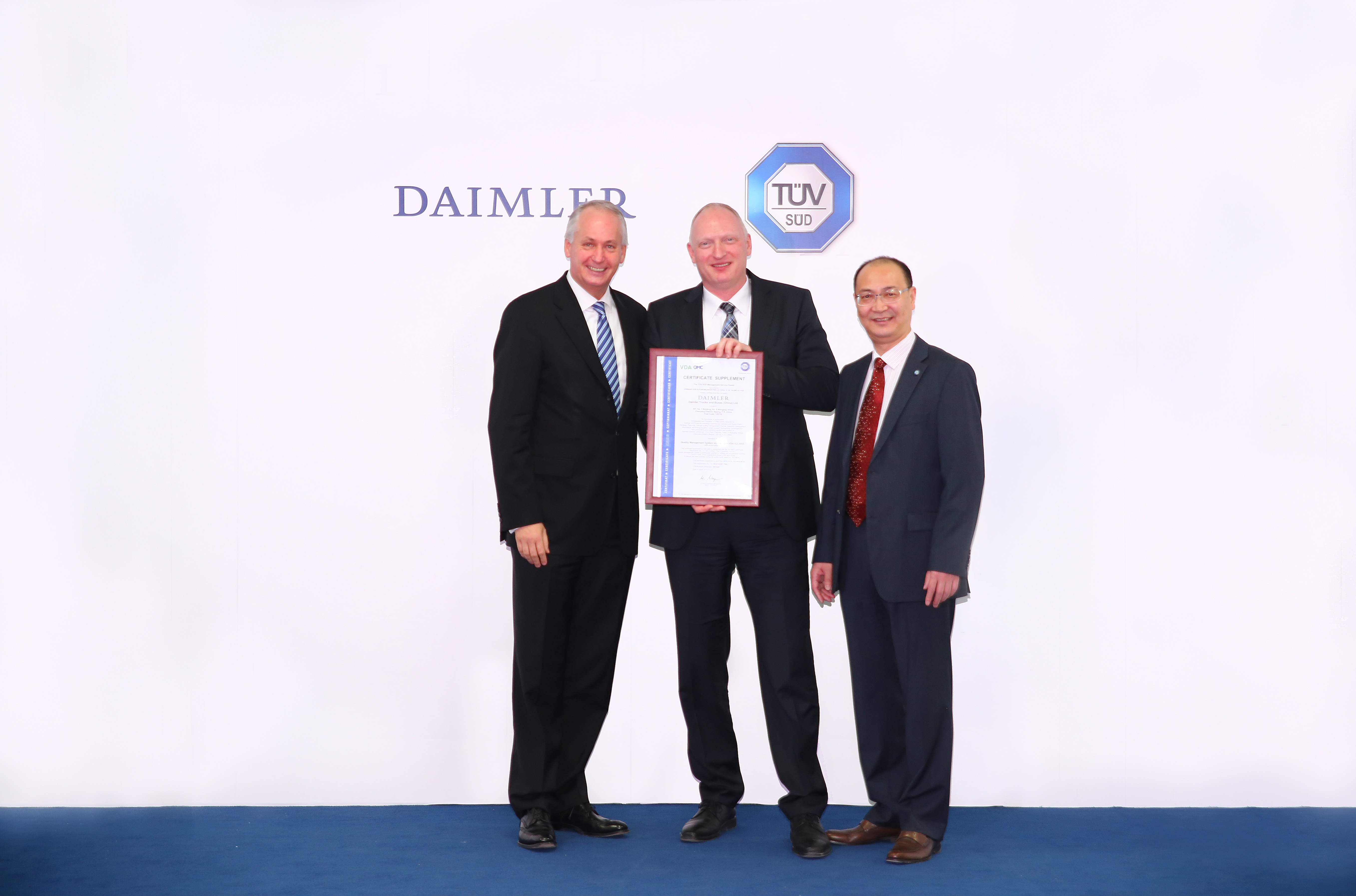 在戴姆勒負責大中華區業務的董事會成員唐仕凱先生的見證下,TUV南德意志集團為戴姆勒卡客車(中國)有限公司頒發 VDA 6.2汽車服務業質量標準認證證書。