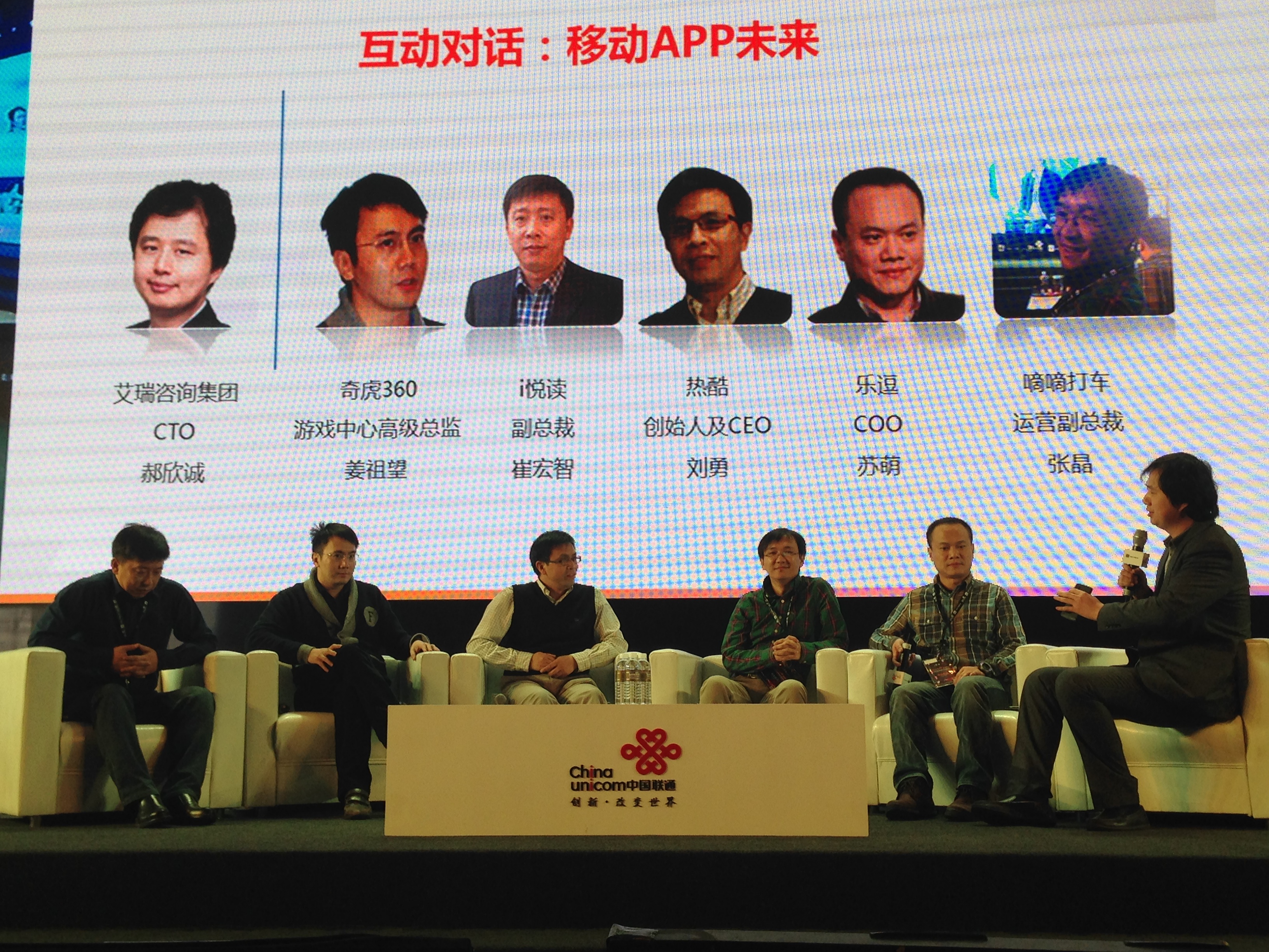在2013年度中國聯通沃商店開發者大會上,嘀嘀打車副總裁張晶(右三)與其他嘉賓探討“移動APP未來”。