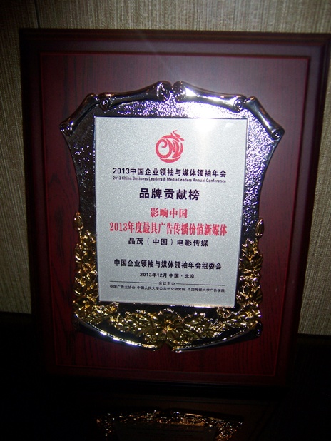北京2013年12月17日電 /美通社/ -- 以“傳播正能量,共筑中國夢”為主題,備受國內企業界、傳媒界、廣告界、藝術界關注的“2013中國企業領袖與媒體領袖年會”暨“品牌貢獻榜年度盛典”,近日在北京金隅喜來登酒店盛大舉行。晶茂(中國)電影傳媒喜獲品牌貢獻榜“2013年度最具廣告傳播價值新媒體”大獎。